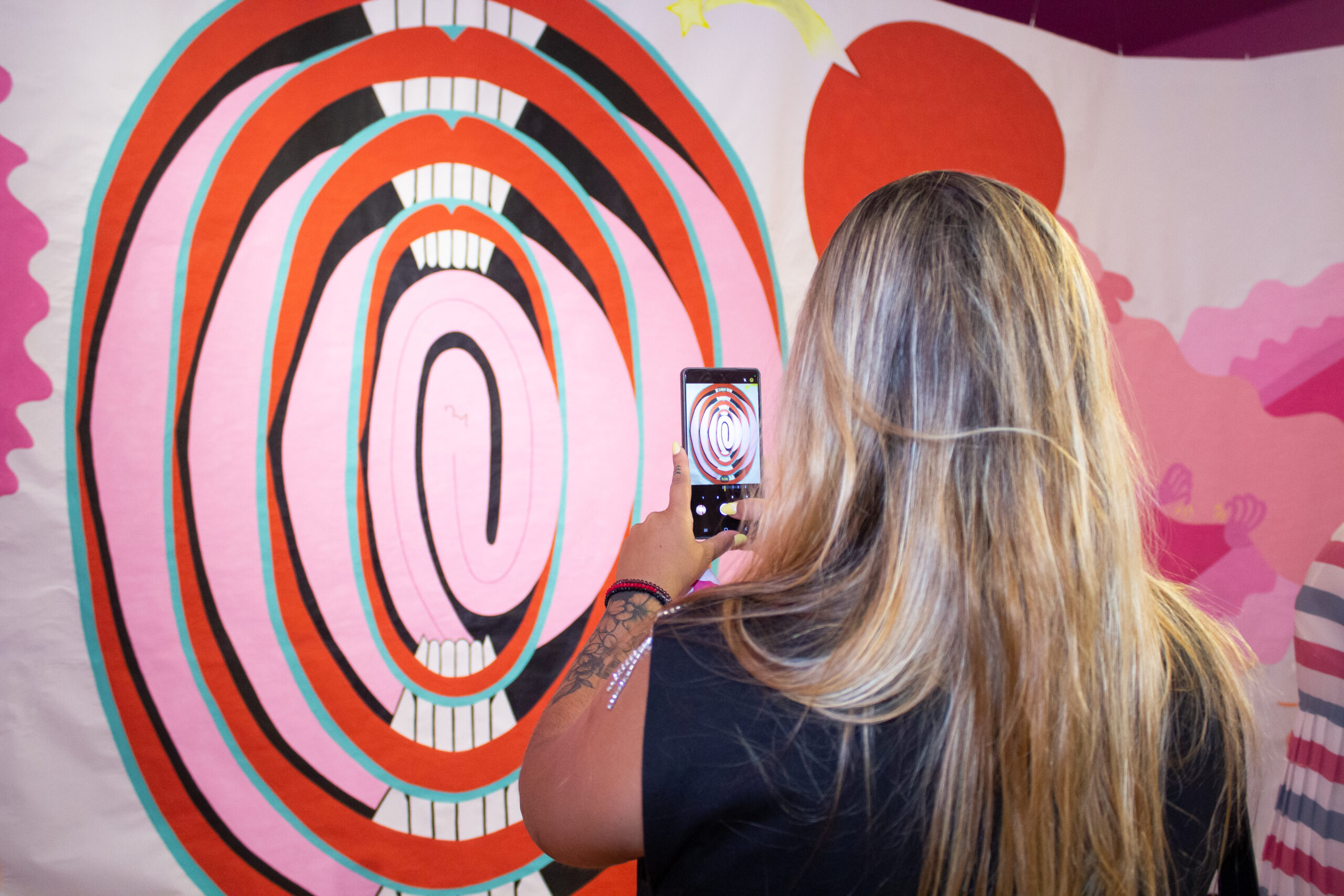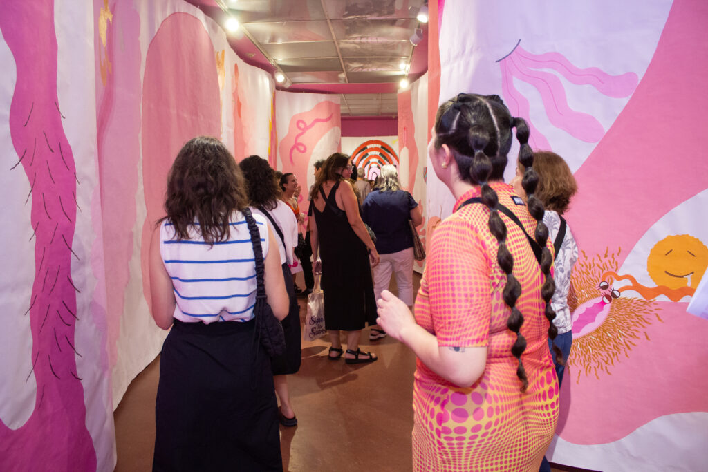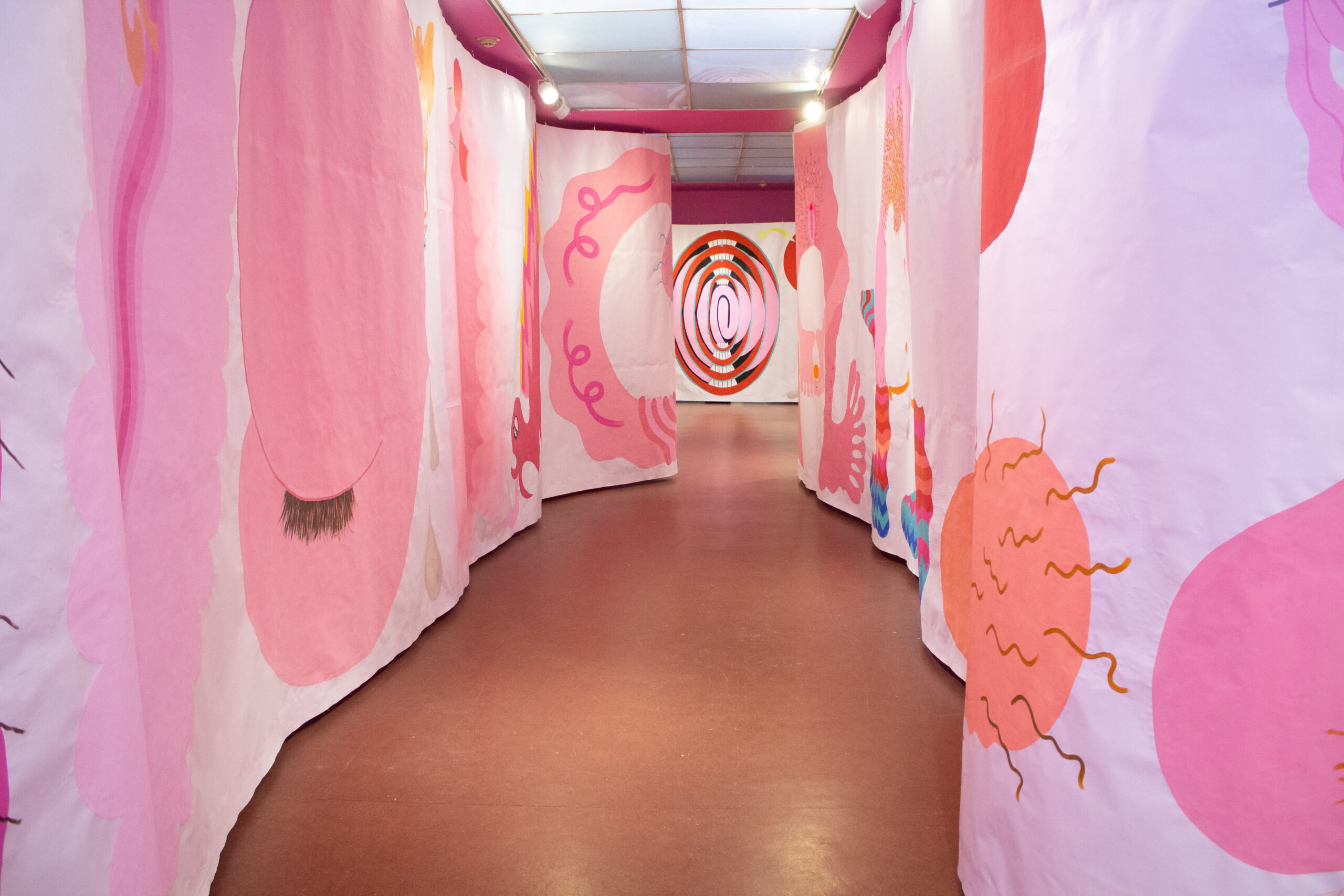 Silvita: Mi hermana Cecilia en todo ese proceso estuvo presente y me observaba… veía que la cosa necesitaba desbordarse más, y se le ocurrió a ella que armara una muestra afuera, en el museo por ejemplo, y me propuso la gran escala, y un papel gigante que abarcara todo, yo estaba subida a una locomotora que no podía parar de pintar, y le dije que sí. Ella pensó en un gran papiro zigzagueante para que todxs nos metamos adentro. Mientras dibujaba y pintaba escuchaba música psicodélica de los años 70, a todo volumen, eso me daba mucho empuje para seguir pintando, era mi combustible, me inspiraba y potenciaba.